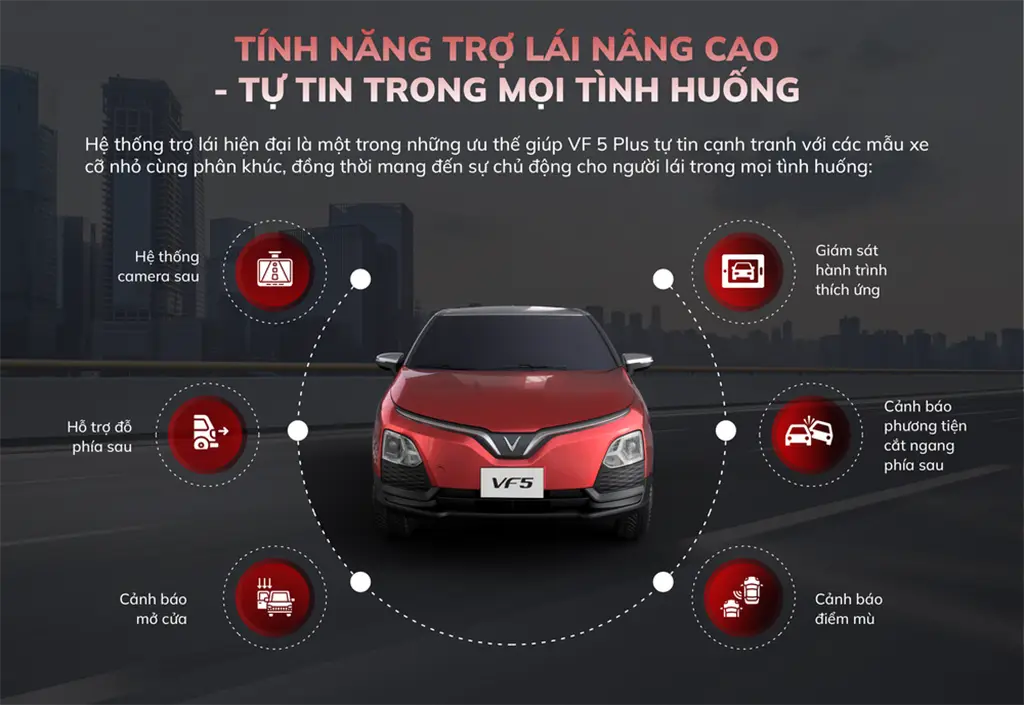 VF5 không chỉ chú trọng đến hiệu suất mà còn đặc biệt quan tâm đến an toàn. Mẫu xe này được trang bị nhiều tính năng an toàn như hệ thống phanh ABS, cảm biến va chạm và nhiều túi khí, đảm bảo an toàn tối đa cho người lái và hành khách. Với các công nghệ hỗ trợ lái tiên tiến, VF5 giúp người lái dễ dàng kiểm soát trong mọi tình huống.